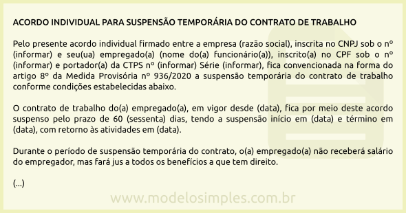 Diante do acima explanado, fornecemos a seguir um modelo de acordo individual para suspensão temporária do contrato de trabalho.