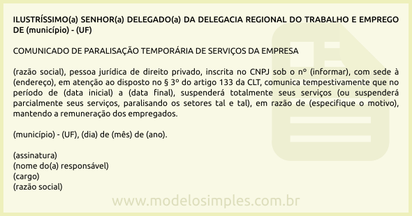 Diante disso, disponibilizamos abaixo um modelo de comunicado de paralisação temporária dos serviços da empresa ao Ministério do Trabalho e Emprego.