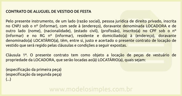 Para isso fornecemos abaixo um modelo de contrato de aluguel de vestido de festa.
