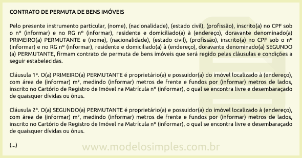 Portanto, abaixo disponibilizamos um modelo de contrato de permuta de bens imóveis com valores equivalentes.