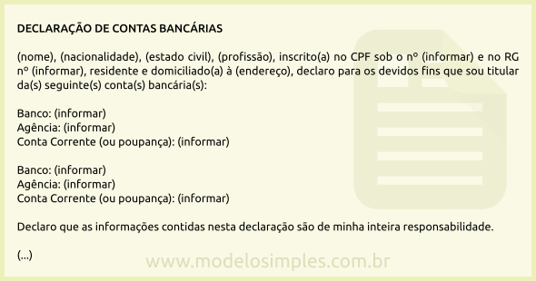 (nome), (nacionalidade), (estado civil), (profissão), inscrito(a) no CPF sob o nº (informar) e no RG nº (informar), residente e domiciliado(a) à (endereço), declaro para os devidos fins que sou titular da(s) seguinte(s) conta(s) bancária(s):