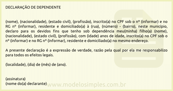 (nome), (nacionalidade), (estado civil), (profissão), inscrito(a) no CPF sob o nº (informar) e no RG nº (informar), residente e domiciliado(a) à (rua), (número) - (bairro), neste município, declaro para os devidos fins que tenho sob dependência meu(minha) filho(a) (nome), (nacionalidade), (estado civil), (profissão), com (idade) anos de idade, inscrito(a) no CPF sob o nº (informar) e no RG nº (informar), residente e domiciliado(a) no mesmo endereço.